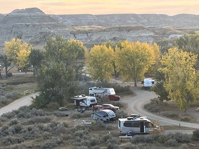 At least two highlights for us. Vermilion Campground meeting up with rally friends Katherine, Brian, and Josie, and visiting Dinosaur Provincial Park walking trails, listening to the meadowlarks sing. On top of the world!