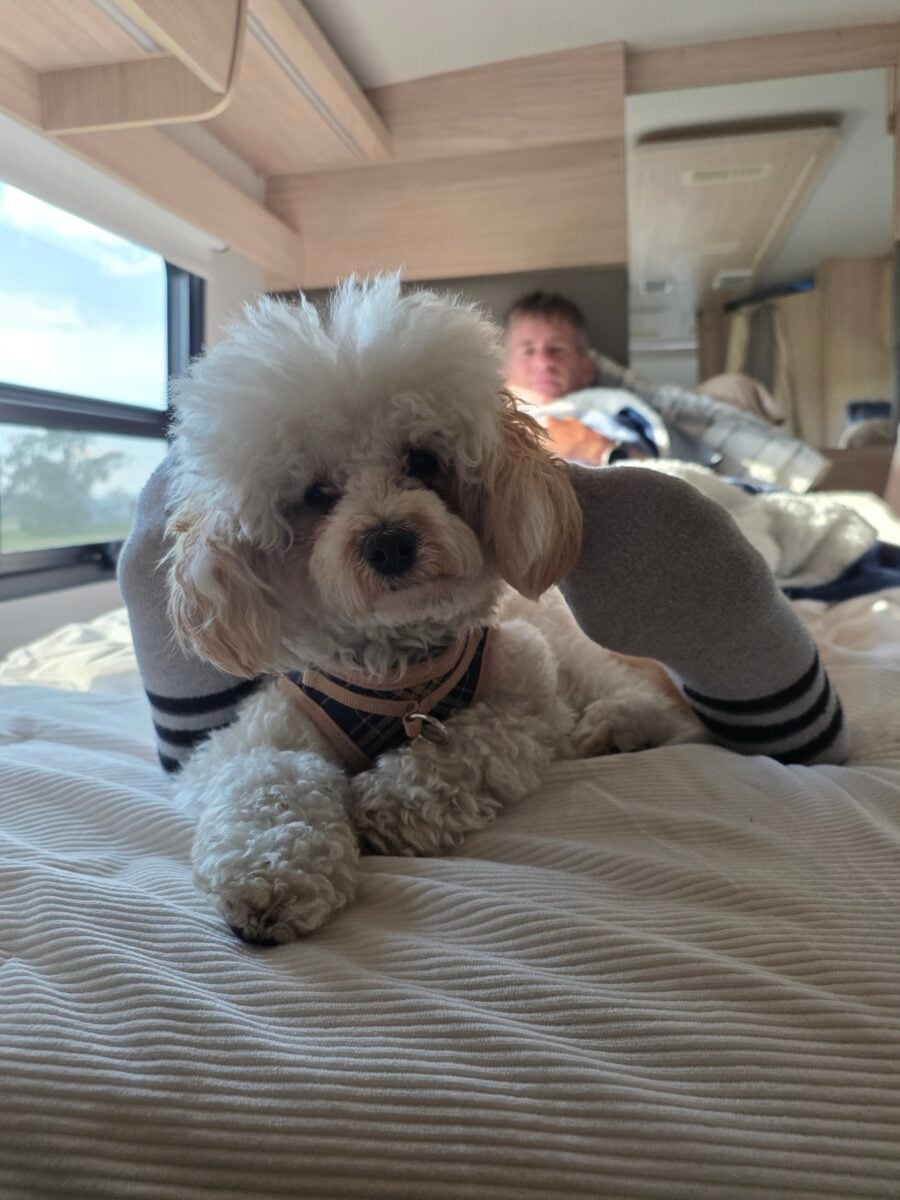 Our highlight was Sammy, our mini goldendoodle, loving our Wonder Rear Twin Bed.