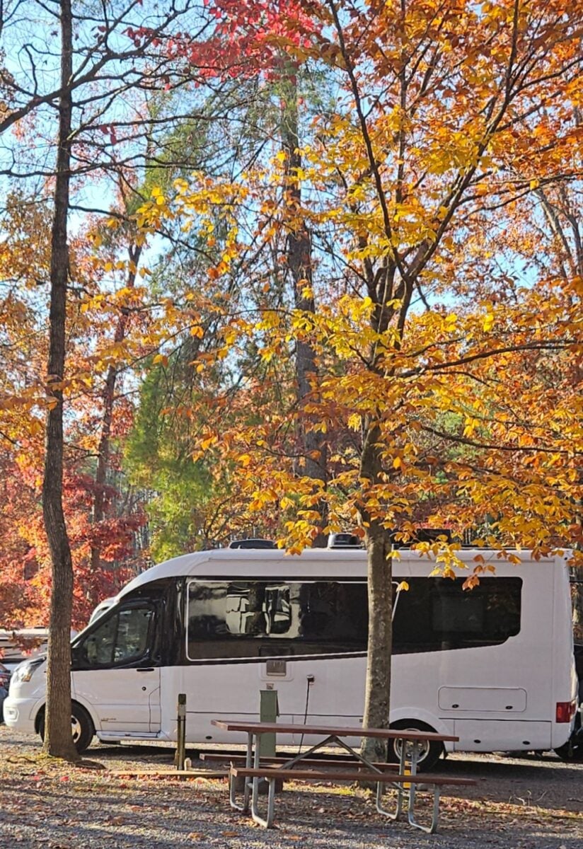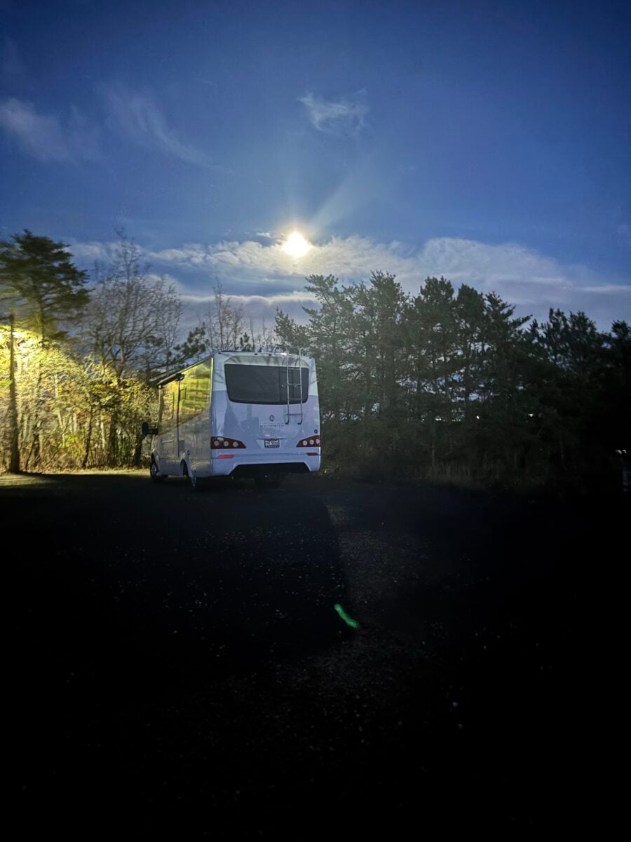 So off to the party we went. We had a wonderful evening–this was such a well-done event! We look forward to doing it next year, and of course, we had some wine. But after some dessert, water, and plenty of wine-free time, we headed out to drive our brand-new-to-us RV to our final destination—we used a map app to route us. Because surely it would know the best route to our night’s host vineyard in this new-to-us farm and forested land. We headed out into the dark, making a left turn instead of the right turns most other cars were taking, and after a few minutes, we started pondering, Are we sure we’re on the right route? This looks pretty dark, and is it getting narrower? After some more dirt road, a bit of gravel, and a few low-hanging trees with their shadowy, spooky vibe, we could see that the app was taking us on the ‘shortest’ route. Not the safe, straight, and simple route that loops around. Safe to say, we made it through without a hitch or a witch in sight. Trial by fire it was. But now we’ve got the confidence to take our brand-new-to-us Leisure Travel Van to the spookiest of destinations we can imagine.