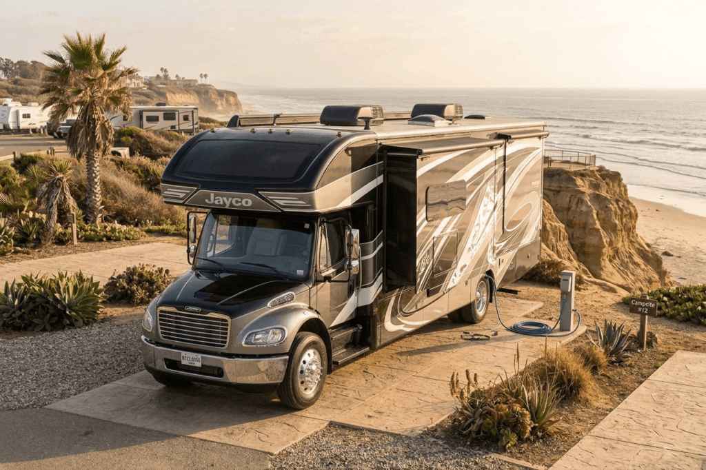 - Thermal Defense & Construction: To combat extreme heat, top-tier RVs use “thermal shields” comprising high-density block foam insulation, radiant foil barriers, and reflective-backed blackout shades to minimize solar heat gain.