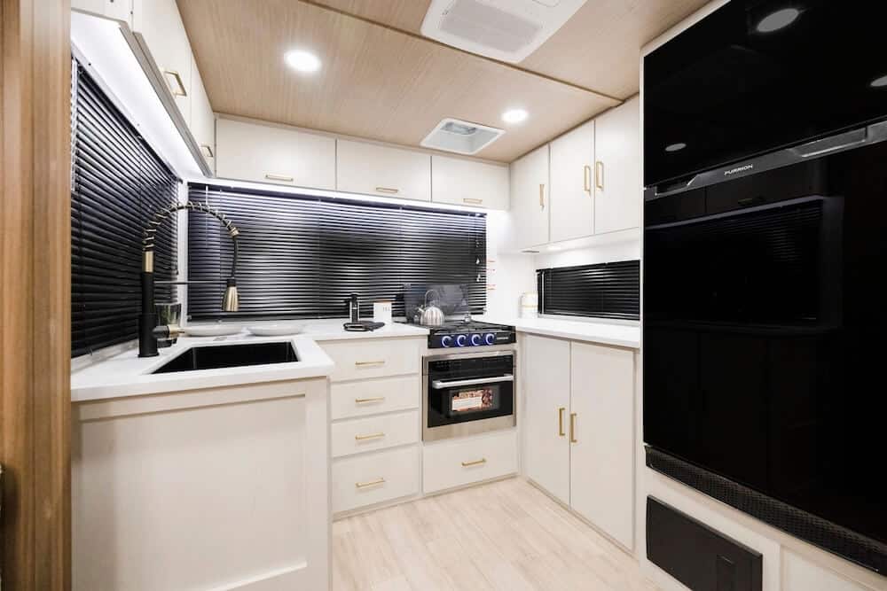 The garage area in the Keystone Fuzion is also climate-controlled, featuring an independent, “free delivery” air conditioner. This makes it a versatile space for kids or a mobile office once the toys are unloaded. Having three dedicated air conditioners also lets you prioritize cooling in specific zones based on your needs.