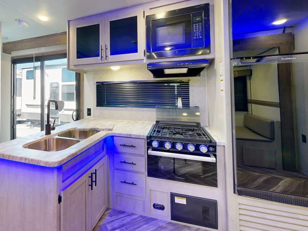 The main living area has an entertainment center and fireplace positioned at an angle, providing easy viewing from the dinette or sofa. Kitchen amenities include a microwave/air fryer, a gas stovetop, and a knife block behind the range. The undermounted stainless sink features a drying rack, while the refrigerator is spacious, measuring 16 cubic feet.