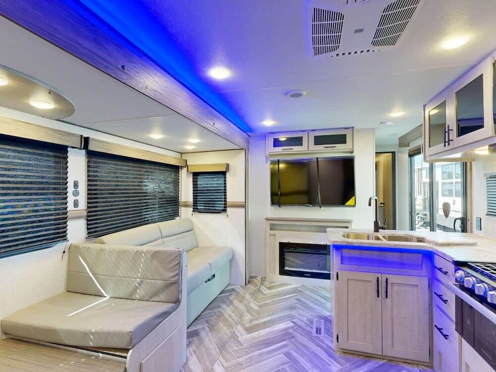 The living area features a comfortable theater-style sofa alongside a booth dinette that converts into a bed. Under the entertainment center, find a pull-out pet dish. The kitchen has a fair amount of counterspace, as well as overhead cabinetry. There’s also a pull-out trash can designed for easy access.