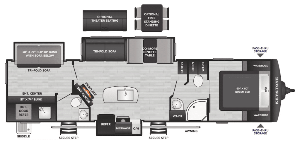 The main bedroom also stands out with its thoughtful design, including extra bedside storage to keep your books, jewelry, or sound machine safe. The main bathroom features a walk-through design that connects the main bedroom to the living area. With its versatile layout and practical features, this Keystone camper is ready to elevate your family’s adventures.