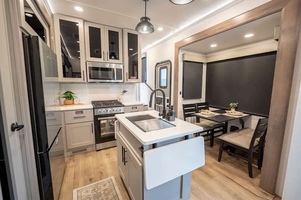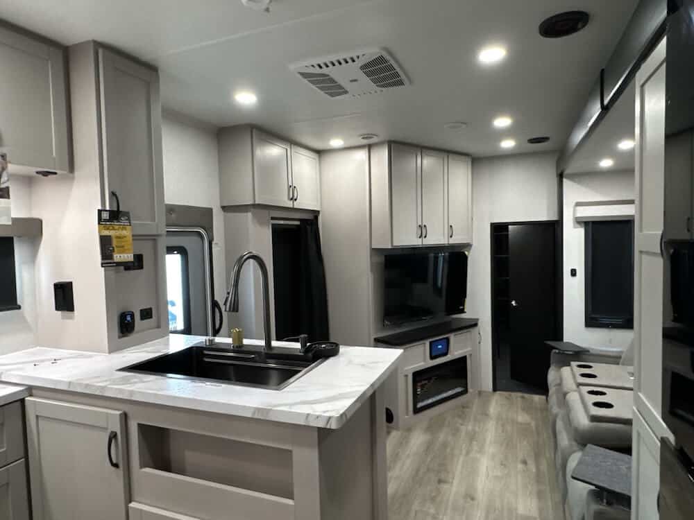 Inside, this toy hauler 5th wheel balances functional design with comfortable touches you’ll appreciate on extended camping trips. The living area features a cozy fireplace and plenty of seating, while the kitchen includes a handy island with flip-up counter extensions, a four-burner cooktop, and solid surface countertops — perfect for cooking meals after a full day outdoors.