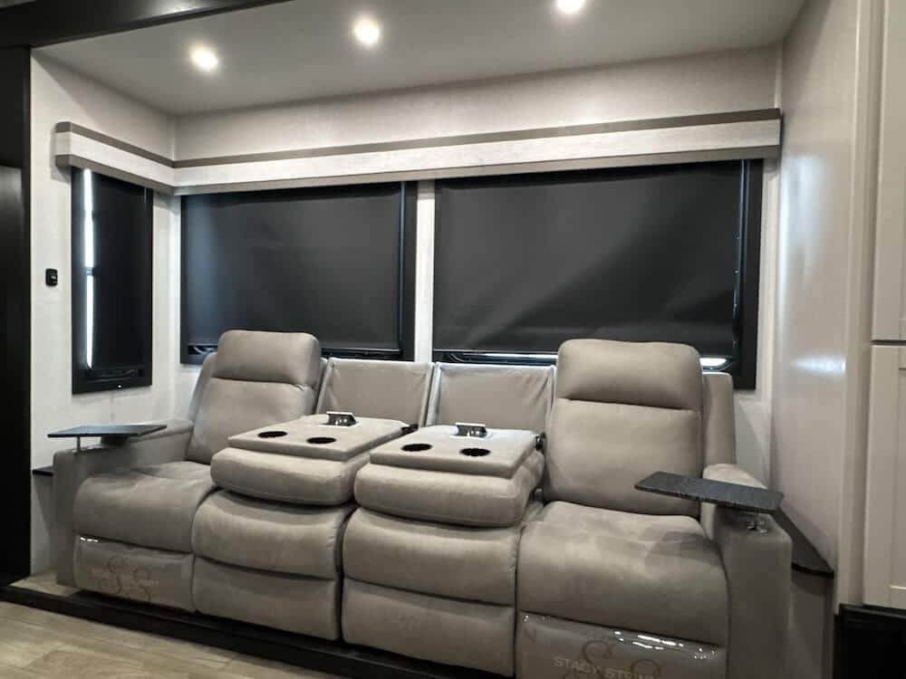 - Residential Luxury in the Wild: These units are far more than just “trailers with garages.” They represent the high end of the fifth wheel market, featuring “at-home” amenities like king-sized beds, solid surface kitchen islands, washer/dryer hookups, and even outdoor entertainment centers with dedicated grills and TVs.