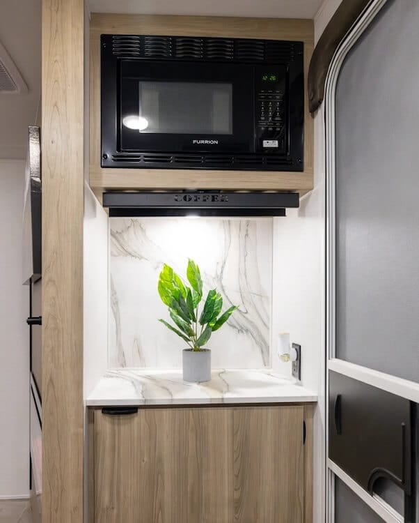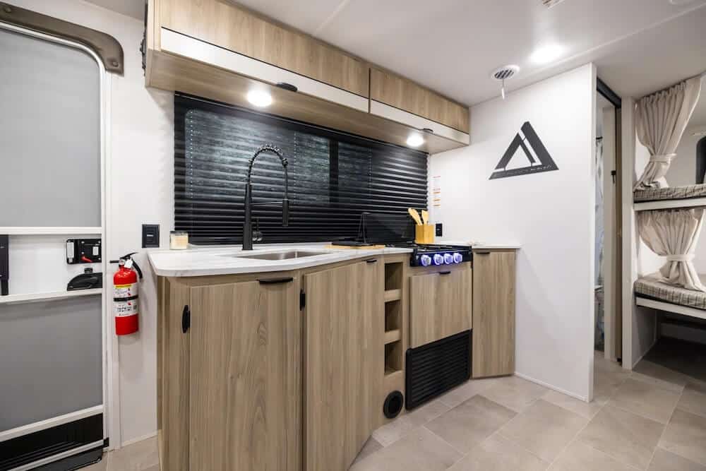 The answers shaped every design choice in the Airelume. We see a large camp-side window, making it easier to watch the kids play while finishing up dishwashing. There’s easy-to-clean flooring because kids (and pets!) get muddy when you’re camping. They designed a dedicated coffee nook so your Keurig or French press doesn’t take up valuable counterspace in your prep areas.