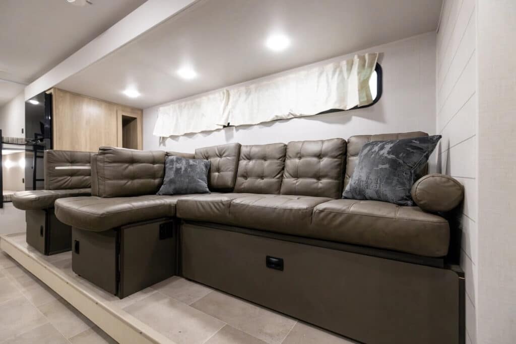 Its 3-in-1 versatility is seldom matched in RV furniture design. It boasts three distinct arrangements: Dining Mode, Movie Mode, and Sleep Mode. The removable central backrest is key to this convertibility. It allows you to flip from a four-person dinette with a jackknife sofa (Dining Mode) to a two-person dinette and a massive chaise lounge (Movie Mode). And for Sleep Mode, remove the backrest, drop down the dining table, and fold out the sofa to create an enormous sleeping space spanning nearly the entire length of the slide room. The best part? Converting between these modes takes less than 60 seconds.