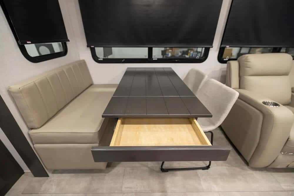 In lieu of an entertainment center, Forest River includes a large TV on a lift that stows behind the dinette when not in use. You can opt for a hide-a-bed sofa if you want to sleep extra guests, but I’d stick with the theater seats.