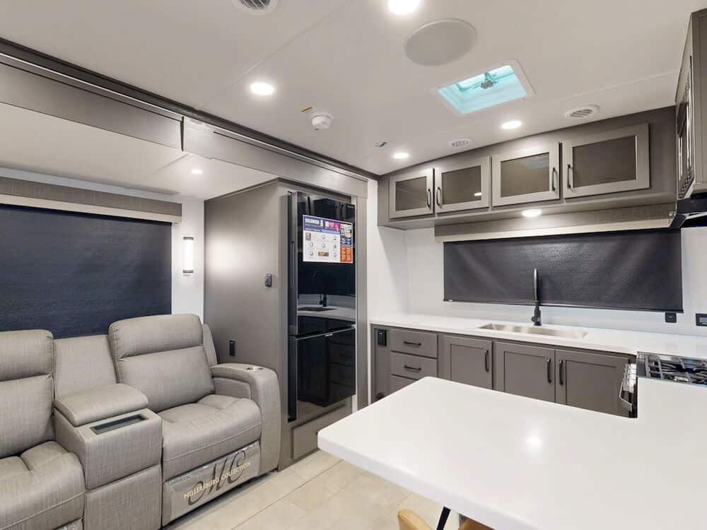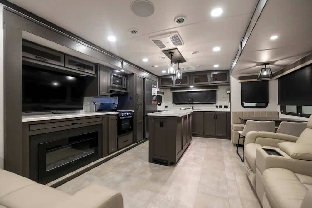 - Chef-Centric Layouts: By shifting the kitchen to the front, these RVs offer more counterspace and residential-grade appliances while keeping the cooking zone separate from the living area.
