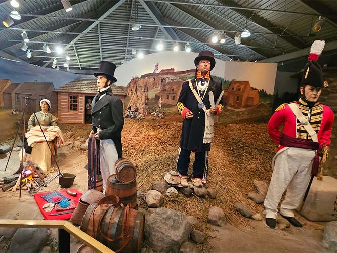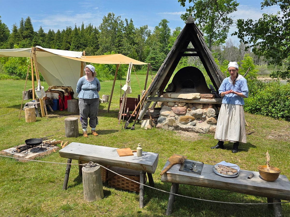 The displays in the museum were quite well done. After the museum, we took the trail out to the foundational remains of Fort St. Joseph. When we arrived at the demonstration area, they had just finished cleaning out the ashes from the bake oven as it had reached cooking temperature. The first thing the staff had baked was nutmeg biscuits, which were very good. Later, they were going to bake some bread. When we went to leave, they offered us some mud seed balls. They took clay and made it into a flat shape, mixed in some dirt, and then placed wildflower seeds in that dirt. Lastly, you formed it into a mud ball, and after it dries out, you can save it until you are ready to plant it. Sharon made a brand new one to give to her mom. Overall, this was an extremely interesting stop and well worth the extra 70-kilometer drive.