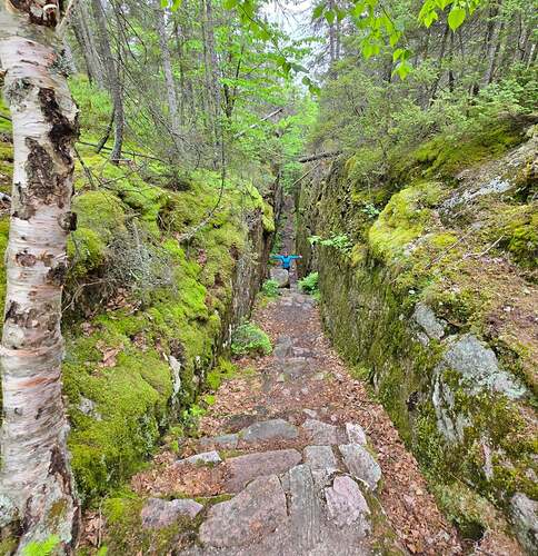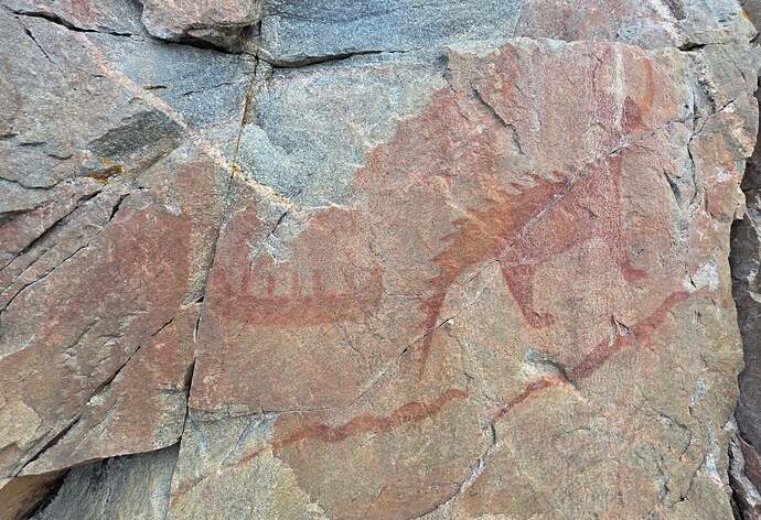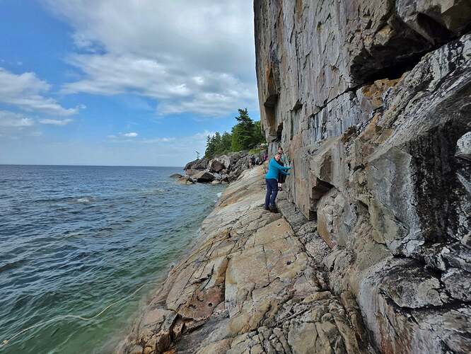 The hike is a short scenic loop through some rock crevasses until you reach the rock wall where the pictographs are located. The Ojibwe people created pictographs of mystical beings, animals, and humans, which are believed to be between 150 and 400 years old. You need a calm day to walk along the rock wall because the waves of Lake Superior can crash against its surface. They have some chains, ropes, and anchor pins to help you traverse the wall. We were able to see most of the pictographs without getting wet or slipping.