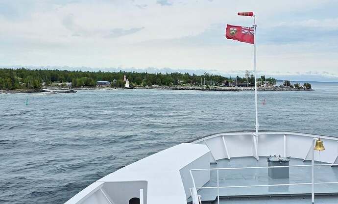 We travelled from our home to Tobermory so we could take the ferry across to Manitoulin Island. We arrived early in Tobermory so we could park in the ferry lanes and go to the Tobermory Brewing Company for an early lunch. I had the blackened salmon with a porter beer, Sharon had the fish tacos, and we shared the turtle cheesecake for dessert. After lunch, we returned to the RV at 12:30 pm, just as it began to pour with rain. Unfortunately, this also meant the first part of the ferry crossing (which is the most scenic) was foggy, rainy, and wavy. However, it was National Indigenous Peoples Day, and they had arranged for drummers, singers, and dancers to perform a show in the forward lounge, so we enjoyed that to pass the time.