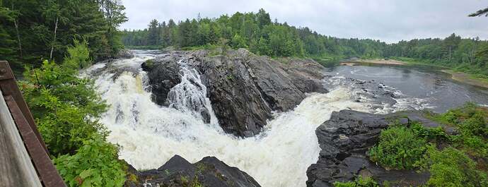 We drove through Manitoulin Island and exited the island across the Little Current Swing bridge. Our destination for the first night was Chutes Provincial Park, and just as we arrived, it started raining again. However, the rain stopped long enough for us to take a walk to see the waterfall. The waterfall got its name from the logging days, when logs would be brought down the river and across the waterfall to flow downstream. The mosquitoes were out after the rain, looking for fresh blood. Later, we realized this was the first time we’ve done the trip in June, and we hadn’t experienced mosquitoes on our other eight journeys. Typically, we’ve been travelling this route in August/September. We soon realized how different the bug situation is at this time of year!