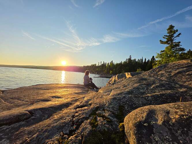 When we first set up, the black flies attacked with a vengeance! We had never experienced this at this park, as we had always camped in August/September. We took a stroll along the shores of Lake Superior and then returned to have BBQ’d steaks for dinner. After dinner, we found a nice spot along the rocky shore to watch the sunset, another very nice one, which we often see from this park.