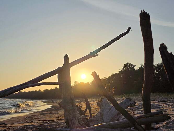 At our campsite, we discovered that the electric outlet was not functioning, although the neighbour’s outlet in the same post was working. We called the office, and they sent maintenance people to look at it, but they couldn’t resolve the issue. We plugged into the neighbour’s outlet since they hadn’t arrived yet. Since we had one of our favourite sites, we really didn’t want to move to another one. The park manager came by and was very apologetic about the issue, offering to reimburse us for the cost of electricity and provide us with free firewood. However, when the neighbours did show up, they didn’t have the 100-feet of electric cord necessary to connect to the pedestal (standard issue in Ontario Provincial Parks), so we got to stay plugged in to their slot, and then they got the credit for the electricity. We realized later that the free firewood was not properly dried, so we spent three hours tending to our smoke fest. However, the sunset more than made up for it.