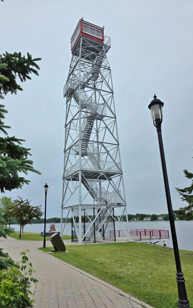 The main road through Fort Frances was under construction, and when we followed the detour route, we discovered some other new things we hadn’t seen before. There was a 100-foot lookout tower that was initially part of the Early Radar Detection system as a defense mechanism during the Cold War. They also had some signboards explaining the history of logging, pulp, and paper in Fort Frances. Lastly, there was a signboard about the North-West Mounted Police when they went through Fort Frances in October 1873. Sharon’s Dad had been involved in the setup of a commemorative statue in Fort Dufferin near Emerson, Manitoba, for the March West.