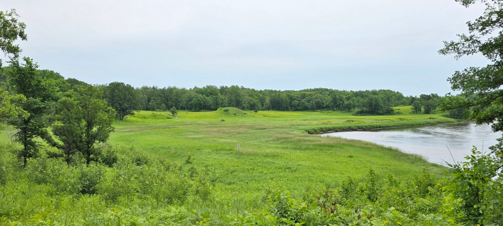 At one point, there were 23 mounds on the site; 15 remain today, and 8 of those are visible from the tour. The fields around the mounds were beautiful with wildflowers and the biggest lady slipper flowers we’d ever seen. The white pelicans migrate through this area, and we saw four in the river. The guide told us they feed on the baby sturgeon fish. The Rainy River band has been trying to preserve the Sturgeon fish population, so they raise and release hatchlings. Sturgeon are considered a threatened species in Canada, so regulations are stricter on the Canadian side of the river. Before we left the mound area, the guide offered to do a tobacco ceremony, where she said a prayer and then released tobacco back to the earth.