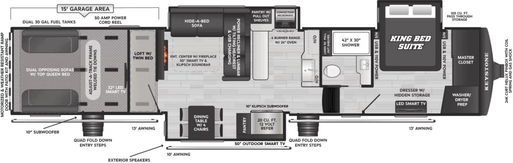With its rugged construction, premium finishes, and immense utility, this toy hauler is the ultimate choice for combining high adventure with high-end living.