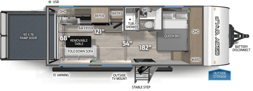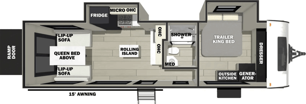 The front is dedicated to a comfortable queen bed and a surprisingly spacious bathroom. While compact, this Grey Wolf RV doesn’t skimp on essentials, offering a full kitchen, a 12V refrigerator, and plenty of USB charging stations. For those seeking a lightweight, feature-rich toy hauler that combines functionality with a touch of luxury, the Grey Wolf Black Label 18RRBL is an excellent choice.