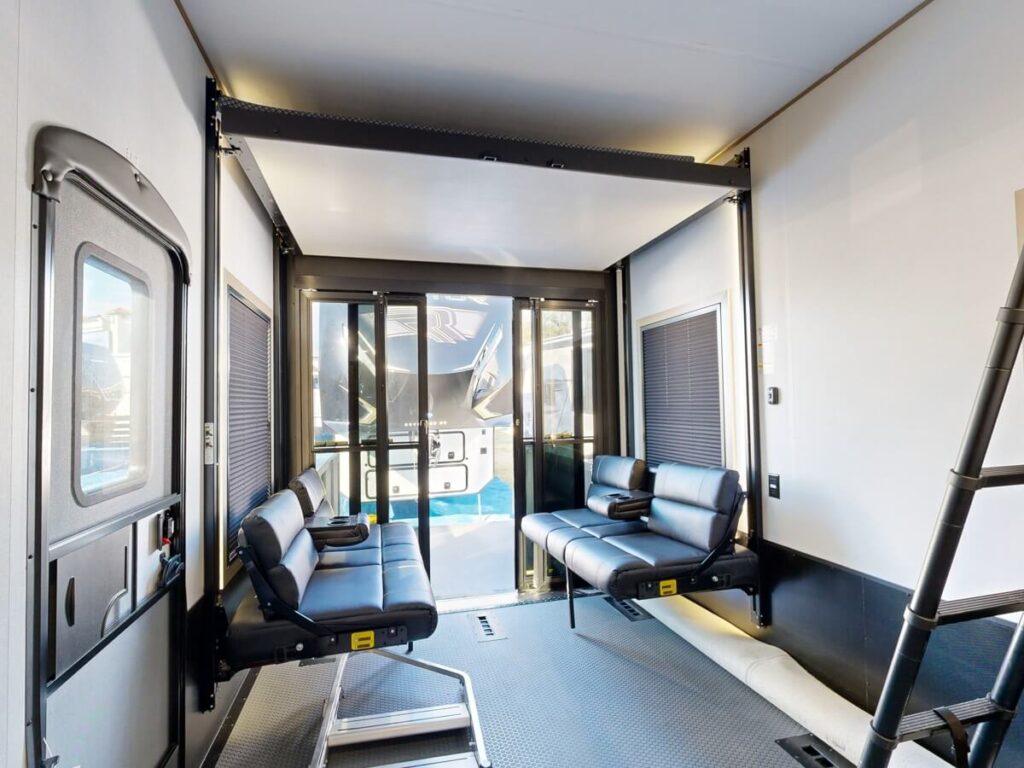 The garage is the centerpiece of this model’s clever design. With up to 182 inches of cargo space when the sofa is folded, it provides a flexible, open floor plan. Once your toys are unloaded, the garage transforms into your primary living space, featuring a fold-down sofa and a removable table. At the rear, the ramp door easily converts into a raised patio deck, extending your living area outdoors and offering a perfect spot to relax.