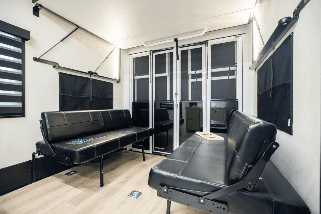 Unlike smaller models where living and garage spaces merge, the Nightfall boasts a separate and luxurious living area. The interior features an electric fireplace, an L-shaped sofa, and an entertainment center with a premium Klipsch sound system. The kitchen features a 24″ oven with a cast-iron cooktop, a large 16-cubic-foot 12-volt refrigerator, solid surface countertops with a waterfall sink, and a residential-style tile backsplash. The main bathroom includes a one-piece molded fiberglass shower, while the primary suite offers a private sanctuary with a king-sized bed and washer/dryer prep.