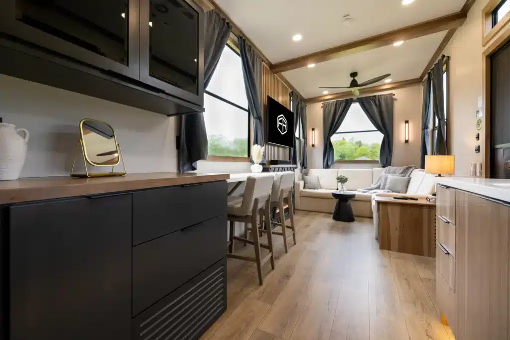 Then they went ahead and added all those luxury features. Just the hardwood alone is enough to sell you on this interior. From the framing around the doors to the decorative slide-out fascia to the windows and cabinetry. It’s got a really upgraded feel that I enjoyed seeing. On this camper in particular, I really like the hidden storage behind the television, the panoramic windows, the extendable dinette—and, lastly, that sleek, modern bathroom.