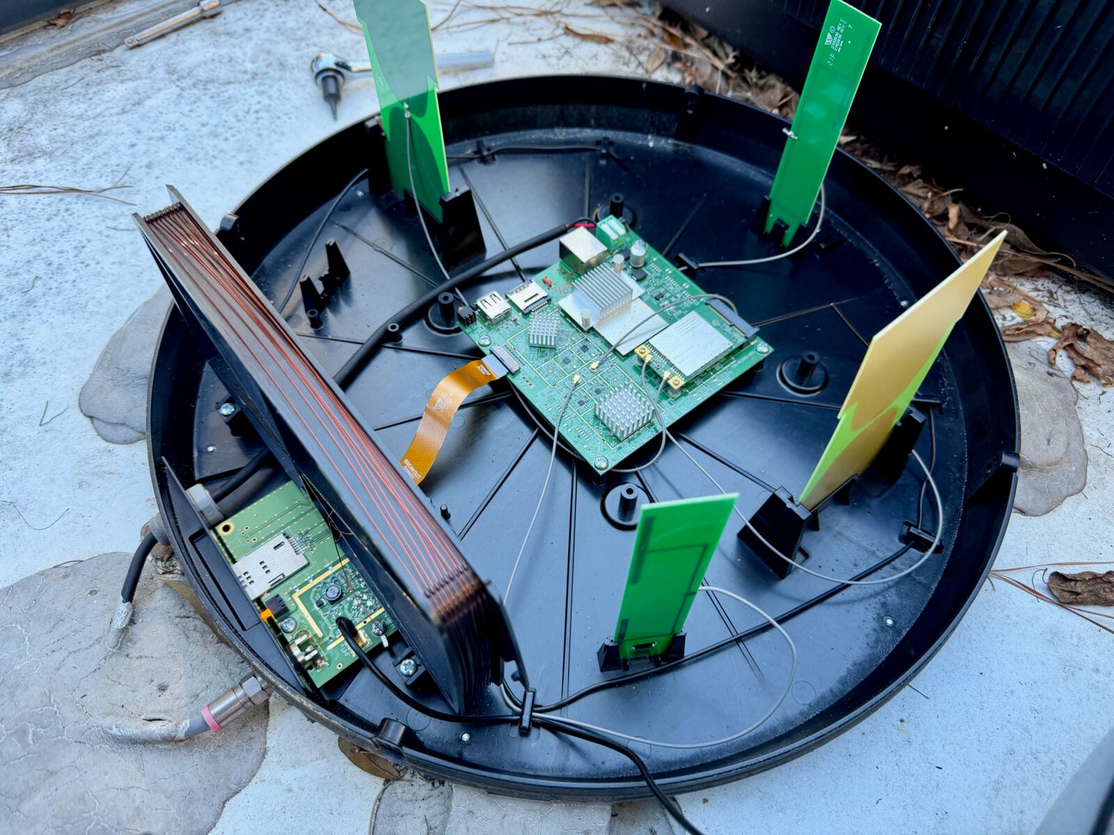 If you can’t find a reset button under the clear plastic baseplate of the antenna, you’ll need to remove the radome cover (four T20 Torx head screws) and press the reset button on the motherboard. Lift the radome slowly and carefully—a black wire connects the dome to the base. Don’t disconnect it. The radome contains antenna elements. The red arrow in the photo below displays the location of the reset button on the motherboard. Press and hold for two full minutes, then wait for a restart.