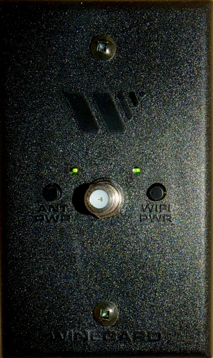 - Power on the antenna. Find the Winegard outlet cover inside your RV with two buttons: one for antenna power and one for Wi-Fi. Press both buttons. A green light should appear after pressing each one. You’ll see a coax / RG-6 cable port on the panel cover. You’ll use that port to connect an RG-6 cable to your TV if and when you connect to cable service at an RV park that offers local cable service. You’ll find the external port for campground cable service in the service bay of your LTV.