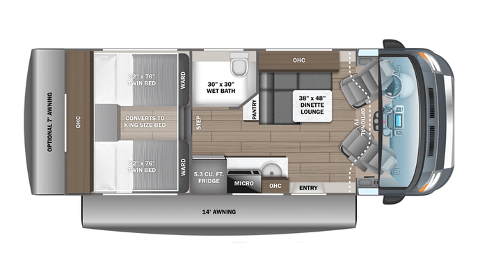 The Freedom Elite 19HE is the ultimate compact Class C RV. Despite its smaller footprint, this compact camper has a lot to offer. The 19HE includes a corner rear dinette that converts into a bed, a striking difference in layout from all of the other RVs on our list. But what would you expect from the smallest of our bunch?