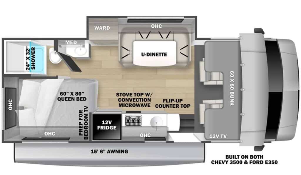 The kitchen is ready for your road trip meals, featuring a three-burner cooktop, convection microwave, sink, and a residential-style 12V refrigerator. In the rear, a clever split bathroom provides privacy for the shower and commode, while leaving the sink and medicine cabinet accessible at all times. While this model is a Ford, this RV is also available on a dependable Chevrolet chassis.
