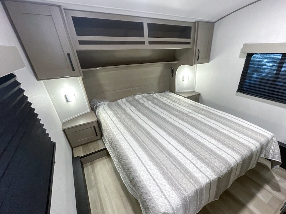 - Campsite Reserve 20JW – The primary suite in this camper is on the main level, saving you from nightly climbs to the loft—but it still has loft space for guests!