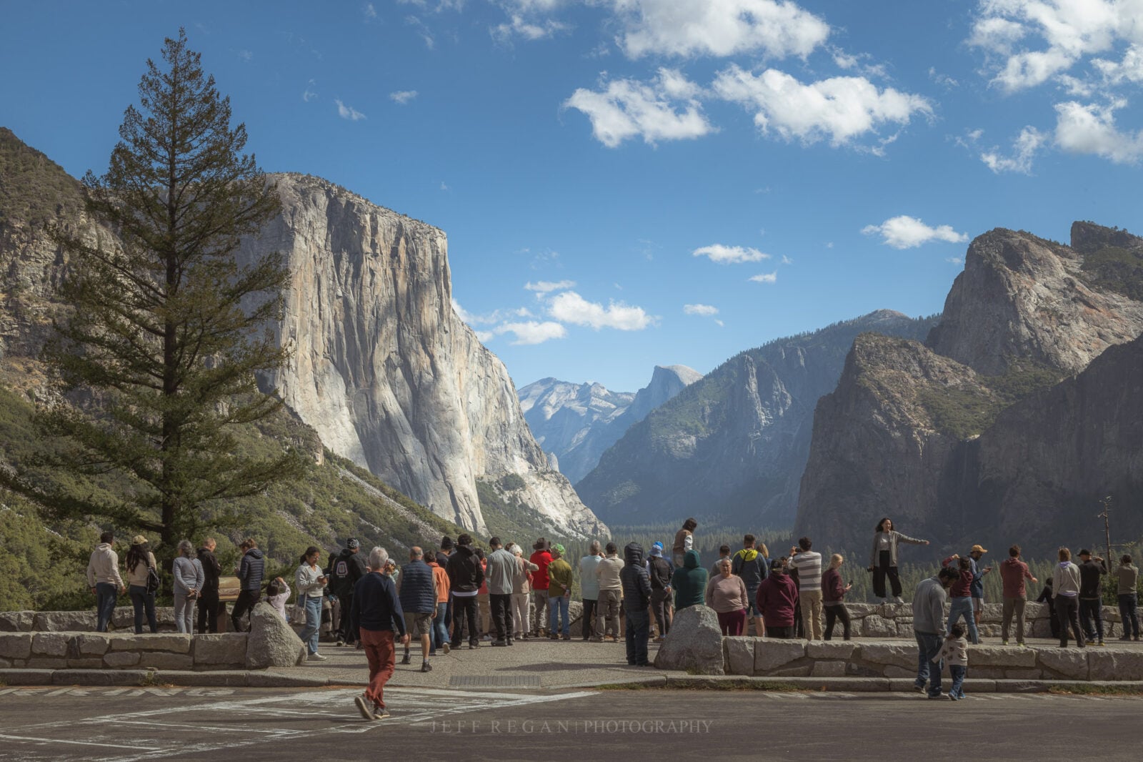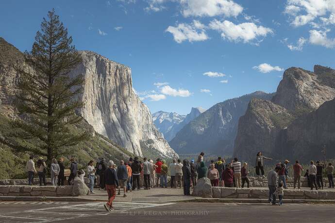 Saturday, I decided to leave the RV park at 4:30 am to beat the crowd for sunrise at Tunnel View. This time, there was no construction, so I arrived a full hour before sunrise. Thought I’d have the place to myself, but 15 minutes before sunrise, a van full of photographers that were part of a photography seminar showed up. They probably had the right lenses with them. I eventually made my way to the Valley floor, where I found a quaint, picture-perfect chapel. When I drove into the parking lot, I saw a group of young men dressed in matching suits. An older man approached my Jeep and said, “Are you part of the bridal party? I’ve got three weddings today.” My attire didn’t quite match the others, so he asked me to leave. No cute chapel shot for me.