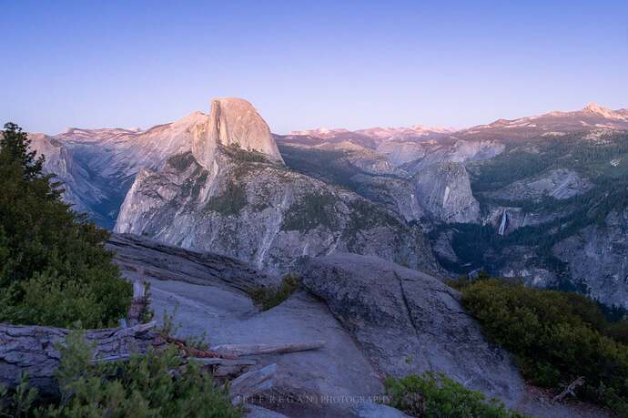 We finally made it to Glacier Point Road, which winds around as it climbs to 7200 feet. Tony was with me in the lead Jeep. The following Jeep pulled off because two pug puppies got car sick (I didn’t even know they were in the Jeep). Tony and I arrived just after sunset, and there was still color on the top half of Half Dome, unlike Tony’s face, which was due to my, uh, intense driving. I figured that, being a retired cop, he’d be used to high-speed pursuits, and I was pursuing sunset! It was worth the effort; photos cannot do this National Park justice. No words, well, certainly not mine.